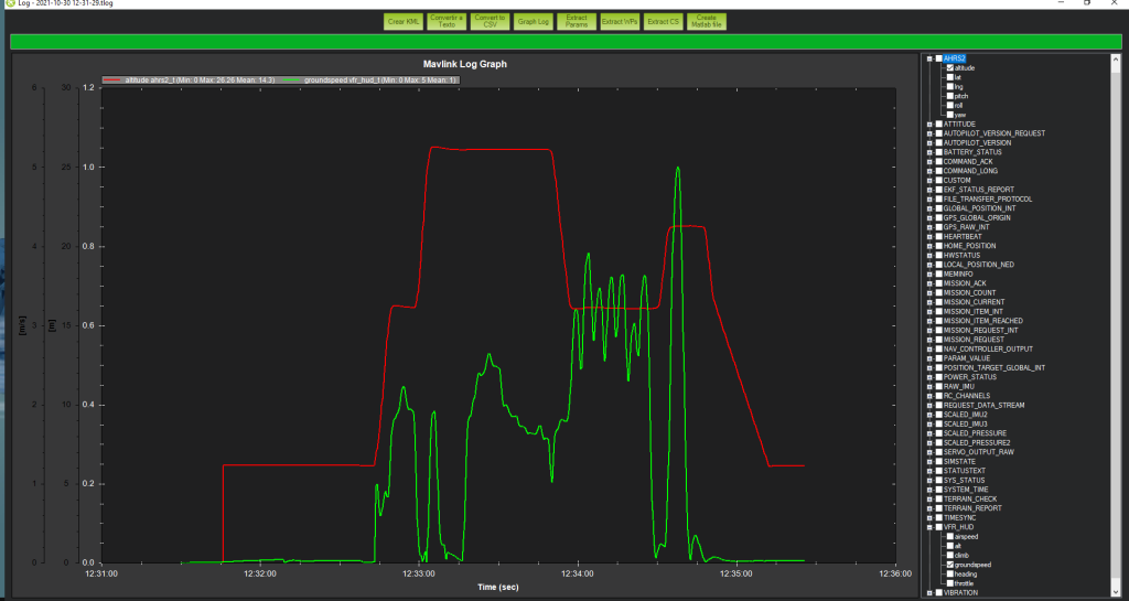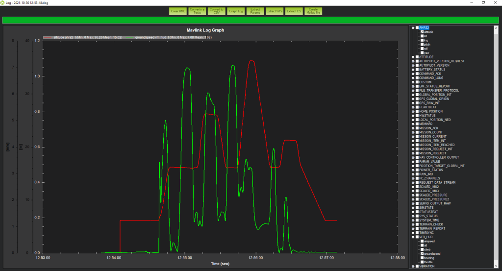 In this second mission, apart from changes in altitude, it is important to see how speed values can be changed. As it can be seen in the green line, the ground speed, the values reach up to 7 m/s, as they had been configured in the flight plan. There is also a time when for a period of time the speed is 0, this is due to a LOITER_TIME of 5 seconds. As for altitude, it also varies up to 30 while, as it had been set up. So we can also say that the behavior has been as expected.