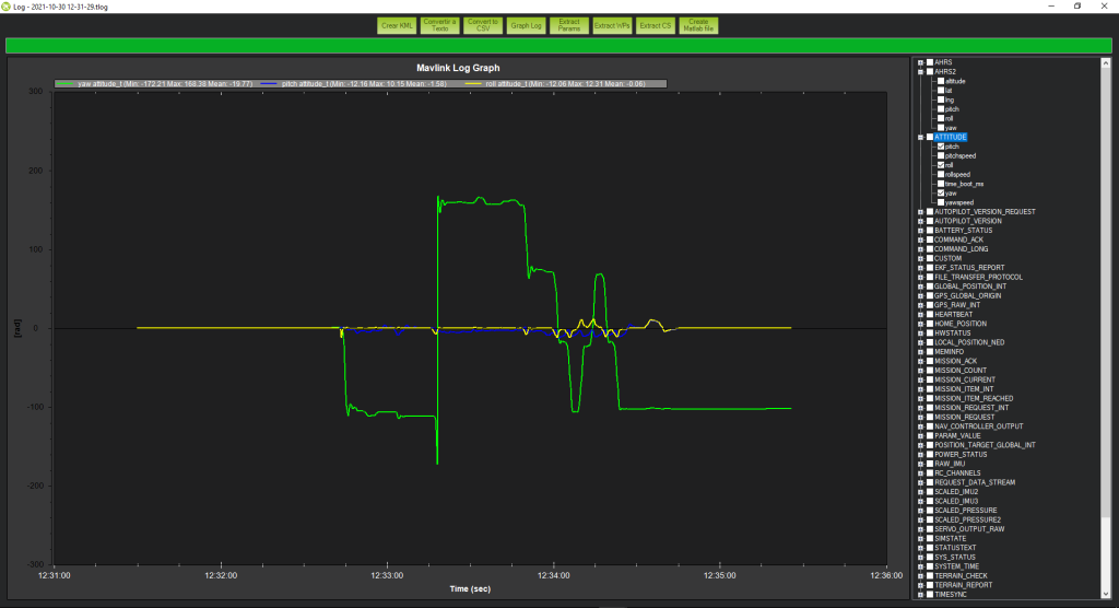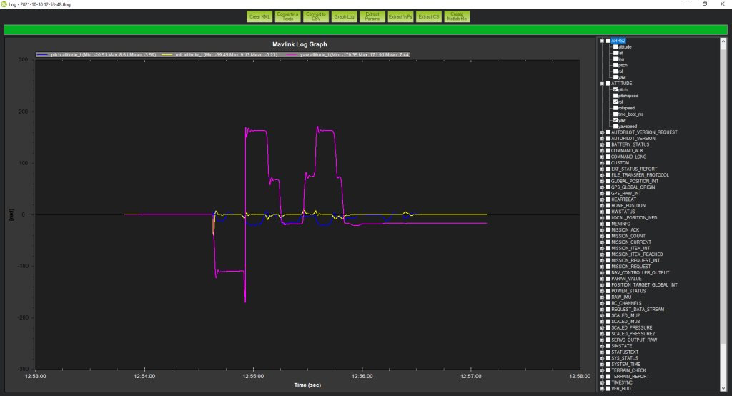 Also in the following image we can see other parameters of Pitch, Roll and Yaw, where the Yaw takes higher values due to the turns we have created in the flight plan.
