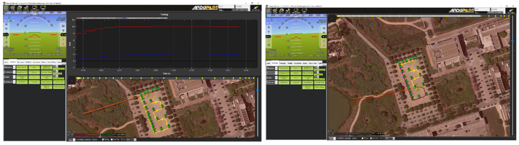 The next step now is just arms the motors and select the DO MISSION button in the left menu. After this the flight will start automatically. In the next pictures, it can be seen how the flight is being developed and also, the logs can be seen simultaneously: