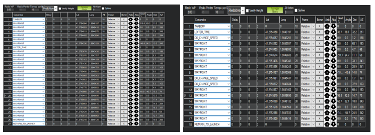 In order to create these patterns, simply click on the map and a WP will appear. These WPs will appear in a table below the map where we can change different parameters in order to customize the behavior we want in our flight. The following images show these tables: