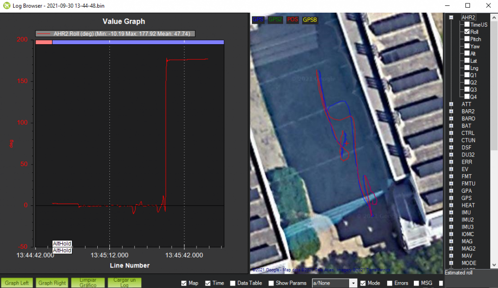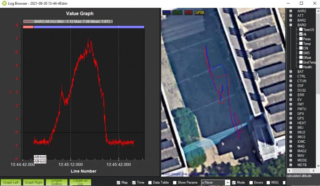As can be seen in the previous images, the plots of the parameters that we have selected in the right column appear on the left. To the right of the plot, the image with the route taken by the Drone captured by the GPS appears. As the site where it was flown does not have much coverage since it is between two buildings, the precision of this route is not very exact. However, the precision of the graphics is, as these are captured by the controller and internal sensors.